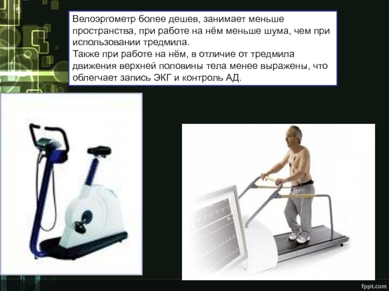 Слайд 27Велоэргометр более дешев, занимает меньше пространства, при работе на нём меньше