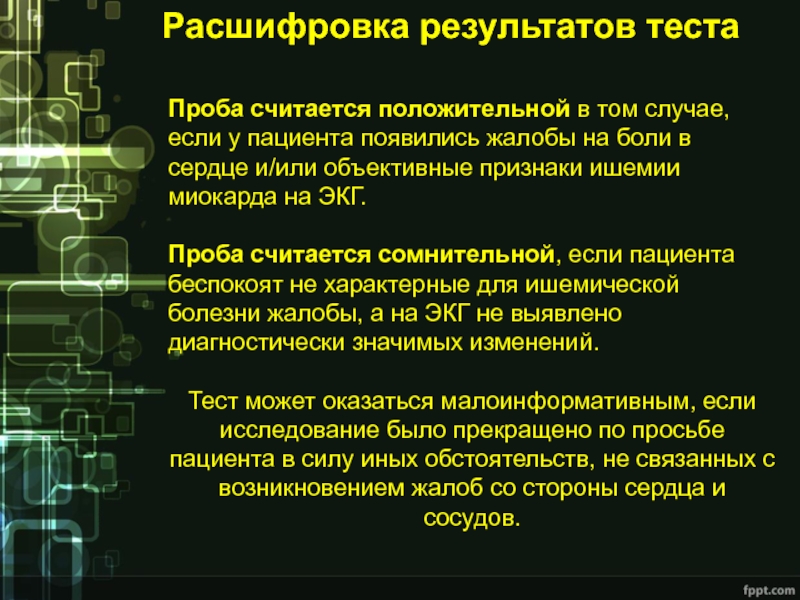 Тест может оказаться малоинформативным, если исследование было прекращено по просьбе пациента в силу иных обстоятельств, не связанных с возникновением жалоб со стороны сердца и сосудов.