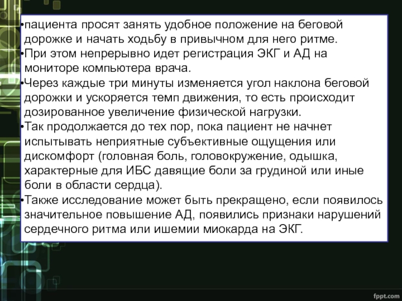 Так продолжается до тех пор, пока пациент не начнет испытывать неприятные субъективные ощущения или дискомфорт (головная боль, головокружение, одышка, характерные для ИБС давящие боли за грудиной или иные боли в области сердца).