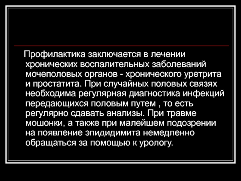 - хронического уретрита и простатита. При случайных половых связях необходима регулярная диагностика инфекций передающихся половым путем , то есть регулярно сдавать анализы. При травме мошонки, а также при малейшем подозрении на появление эпидидимита немедленно обращаться за помощью к урологу.