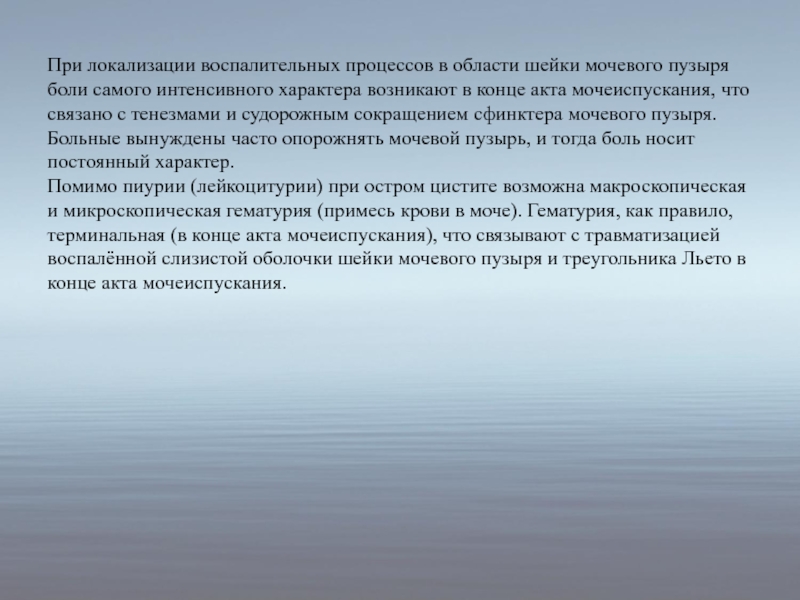Имеют значение нарушения оттока и застой мочи у больных с аденомой предстательной железы, стриктурой (сужением) уретры, камнем мочевого пузыря, нейрогенной дисфункцией мочевого пузыря. Предрасполагающим моментом служит нарушение кровообращения в стенке мочевого пузыря или малом тазу. Изменение слизистой оболочки мочевого пузыря при циститах регистрируется при цистоскопии, которая особенно показана при хронических циститах. На ранних стадиях острого цистита цистоскопию проводить не следует, чтобы не нанести больному дополнительного вреда.
