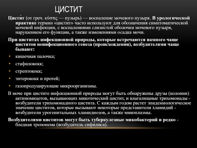 Возбудителями циститов могут быть туберкулезные микобактерий и редко - бледная трепонема (возбудитель сифилиса).