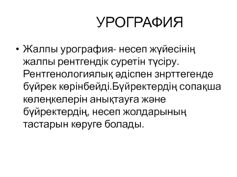 Компьютерлік томография- дегеніміз рентген сәулесін жан-жақты жіберіп, оның томограммасын компьютер арқылы түсіру әдісі.Бұл әдістің науқасқа радиациялық сәулесімен зияндылығына байланысты аса күрделі диагностикалық жағдайда ғана (қатерлі ісікпен зақымданғанда немесе күдік болғанда) қолданылады.Бұл әдіспен зерттегенде бүйрек түбегінің,несепағардың тастары өте жақсы анықталады.
