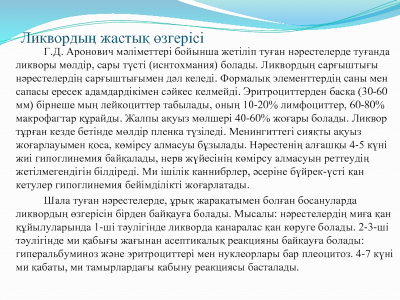 Г.Д. Аронович мәліметтері бойынша жетіліп туған нәрестелерде туғанда ликворы