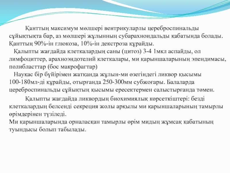 Слайд 14 Қанттың максимум мөлшері вентрикуларлы цереброспинальды сұйықтықта бар, аз мөлшері жұлынның субарахноидальды