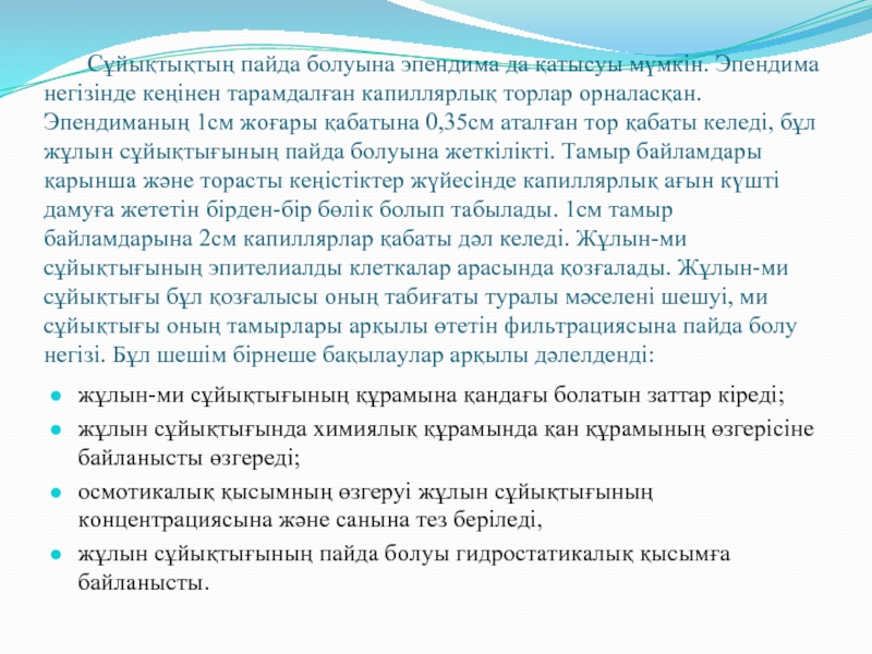 Слайд 8 Сұйықтықтың пайда болуына эпендима да қатысуы мүмкін. Эпендима негізінде кеңінен тарамдалған