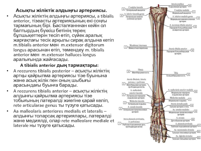 A reccurens tibialis posterior – асықты жіліктің артқы қайрылма артериясы тізе буынына және асық жілік пен оның шыбығы арасындағы буынға барады.