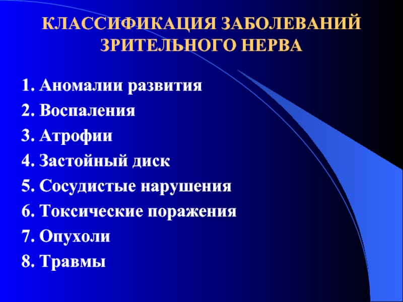 Слайд 9КЛАССИФИКАЦИЯ ЗАБОЛЕВАНИЙ ЗРИТЕЛЬНОГО НЕРВА