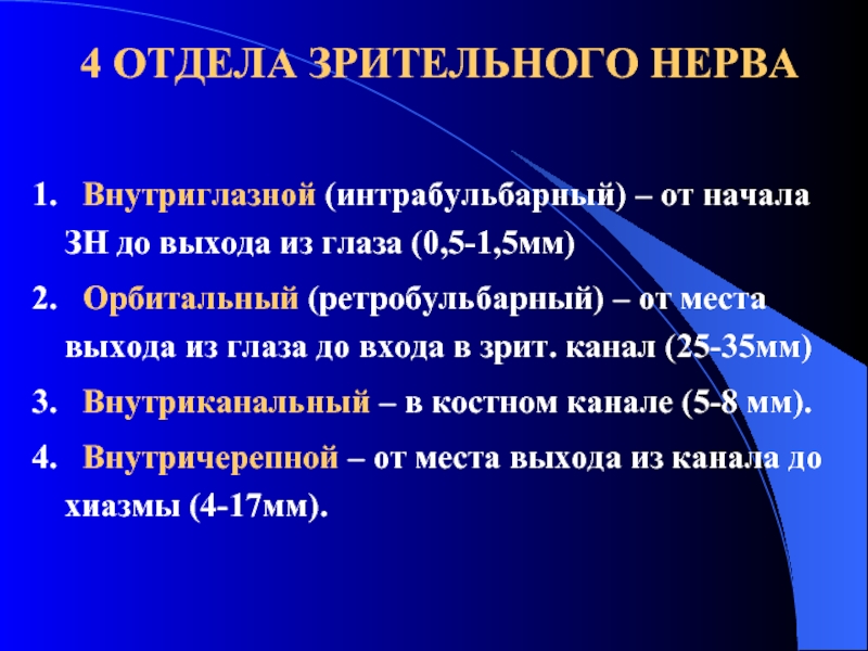 2. Орбитальный (ретробульбарный) – от места выхода из глаза до входа в зрит. канал (25-35мм)