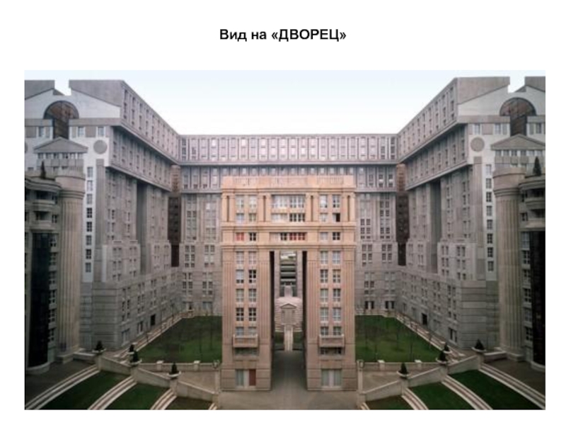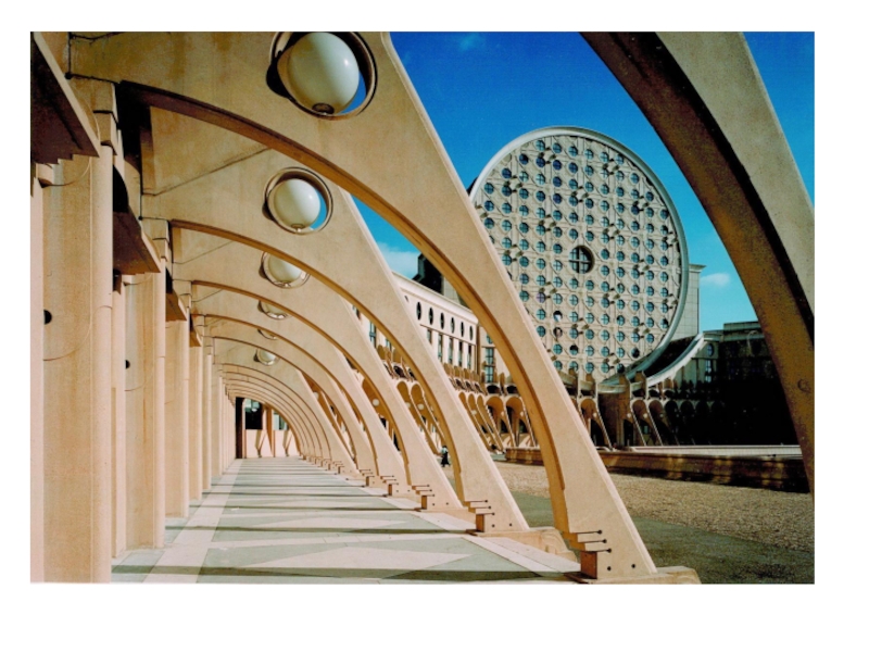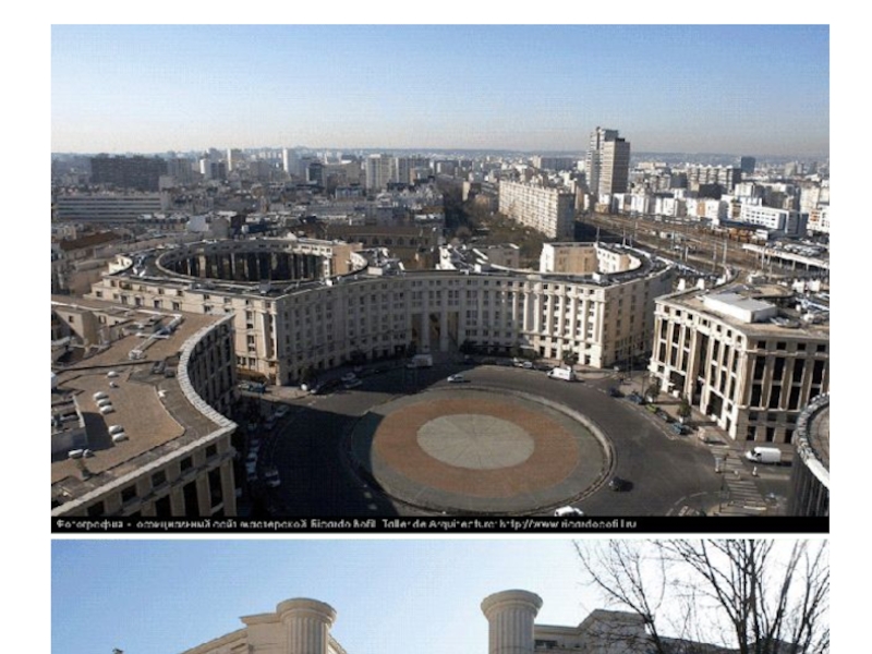гг. в новом городе Марн-ля-Валле под Парижем. Он включает 591 квартиру и делится на три здания: Дворец в 19 этажей, Театр в 9 этажей и Арка в 10 этажей. Этот жилой монумент, воплотивший идею греческого театра, имеет форму полукруга. На внутреннем фасаде до седьмого этажа сделаны большие колонны из стекла, выполняющие роль эркеров. Их блестящие поверхности увенчаны двухэтажным фризом и карнизом, на котором размещена богатая растительность. В нижней части здания — амфитеатр из широких озелененных террас. Строительство, несмотря на сложный и многообразный архитектурный язык, выполнялось из типовых сборных деталей заводского изготовления.