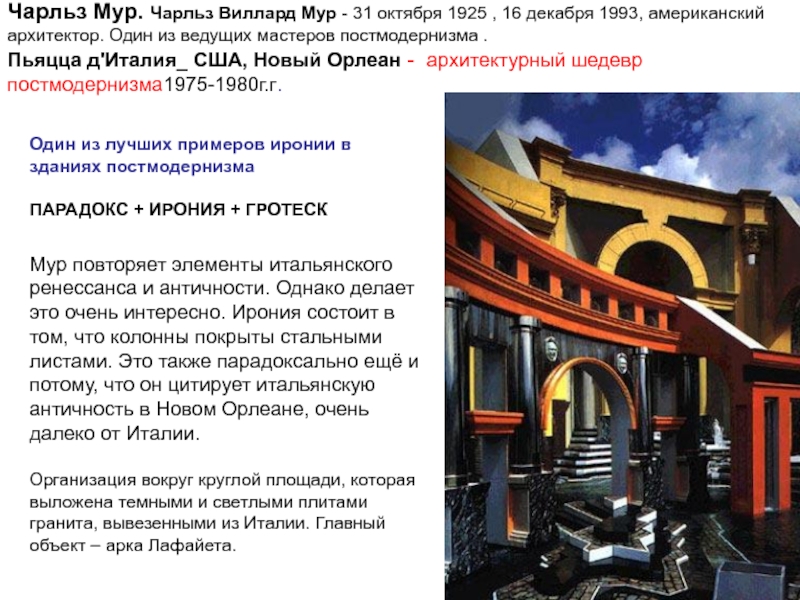 Мур повторяет элементы итальянского ренессанса и античности. Однако делает это очень интересно. Ирония состоит в том, что колонны покрыты стальными листами. Это также парадоксально ещё и потому, что он цитирует итальянскую античность в Новом Орлеане, очень далеко от Италии.