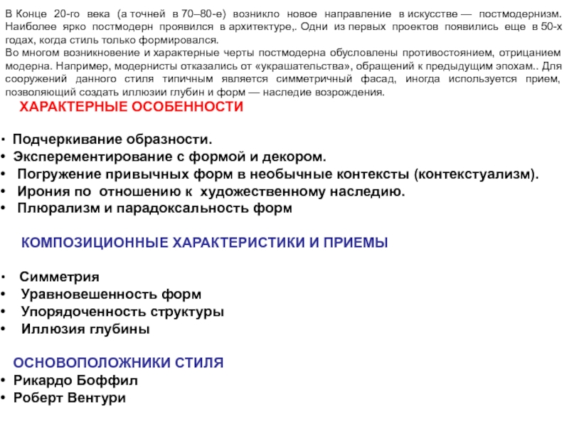 Слайд 3В Конце 20-го века (а точней в 70–80-е) возникло новое направление в искусстве — постмодернизм. Наиболее