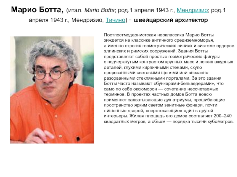 Слайд 56Марио Ботта, (итал. Mario Botta; род.1 апреля 1943 г., Мендризио; род.1 апреля