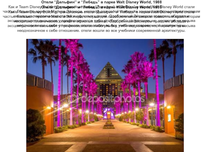 Слайд 42Отели “Дельфин” и “Лебедь” в парке Walt Disney World, 1988