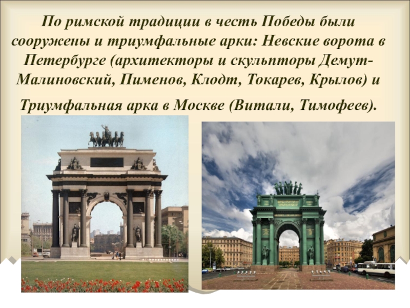 Невские ворота в Петербурге (архитекторы и скульпторы Демут-Малиновский, Пименов, Клодт, Токарев, Крылов) и Триумфальная арка в Москве (Витали, Тимофеев).