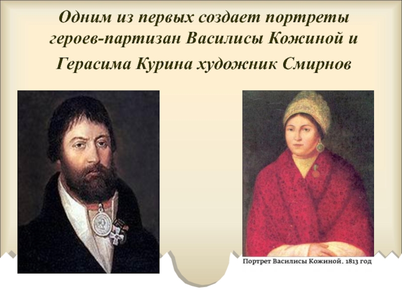 Слайд 12Одним из первых создает портреты героев-партизан Василисы Кожиной и Герасима Курина