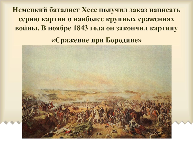 Слайд 18Немецкий баталист Хесс получил заказ написать серию картин о наиболее крупных
