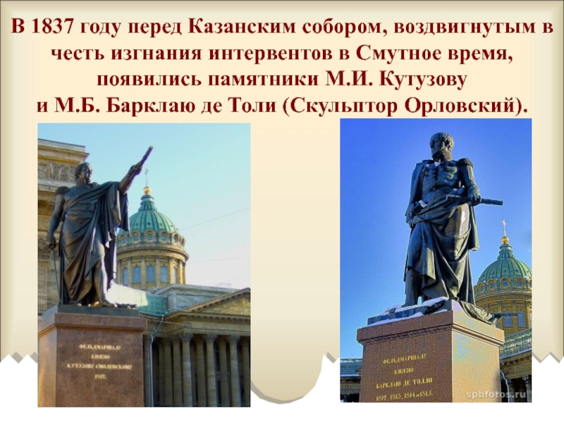 Слайд 10В 1837 году перед Казанским собором, воздвигнутым в честь изгнания интервентов