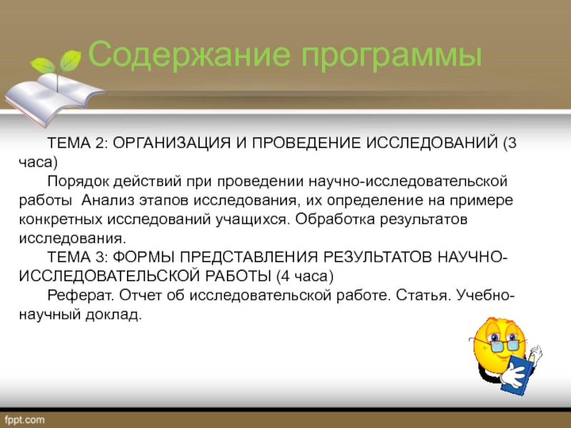 Выбор темы исследования, выработка умения формулировать цель и задачи исследования. Работа с литературой. Выбор источников, сбор и структурирование материала исследования. Аннотация. Цитаты. Ссылки. Обобщение сведений о библиографии. Самостоятельная работа в библиотеке. Составление реферата. Интеллектуальные занятия по развитию лингвистических способностей. Тренировка в изложении основной части реферата. Составление заключения реферата. Элементы коммуникативной культуры. Психологический аспект готовности к выступлению. Развитие дикции. Распространённые ошибки при выполнении учащимися исследовательских работ.