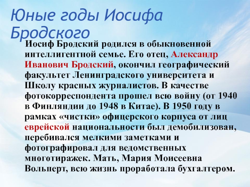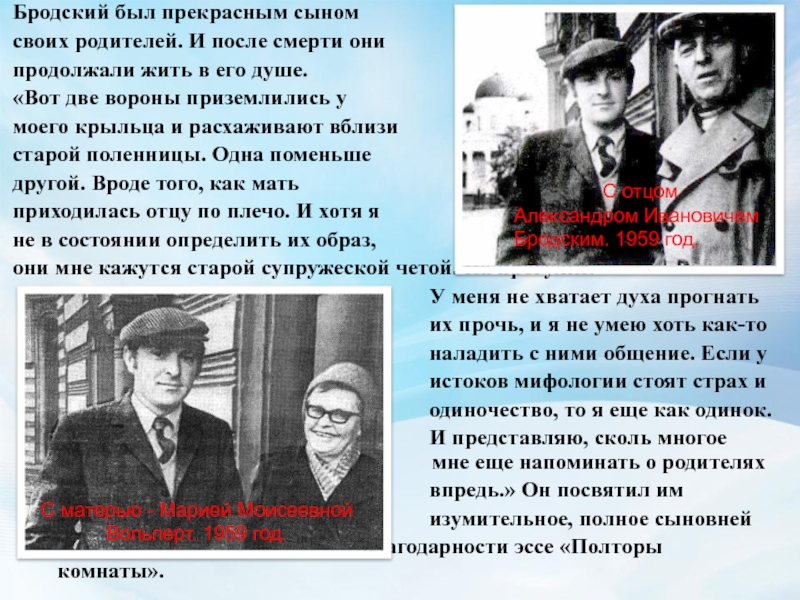 в большую коммунальную квартиру в Доме Мурузи на Литейном проспекте 24/27, и юный Иосиф постепенно отгородил шкафами в ней свое личное пространство, эти знаменитые "полторы комнаты", ставшие его кабинетом, спальней, местом приема гостей, значившие так много в становлении его характера и развитии самостоятельности и свободы мышления... О своем детстве Бродский вспоминал неохотно: «Русские не придают детству большого значения. Я, по крайней мере, не придаю. Обычное детство. Я не думаю, что детские впечатления играют важную роль в дальнейшем развитии».