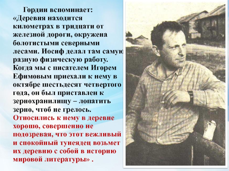 Слайд 17 Гордин вспоминает: «Деревня находится километрах