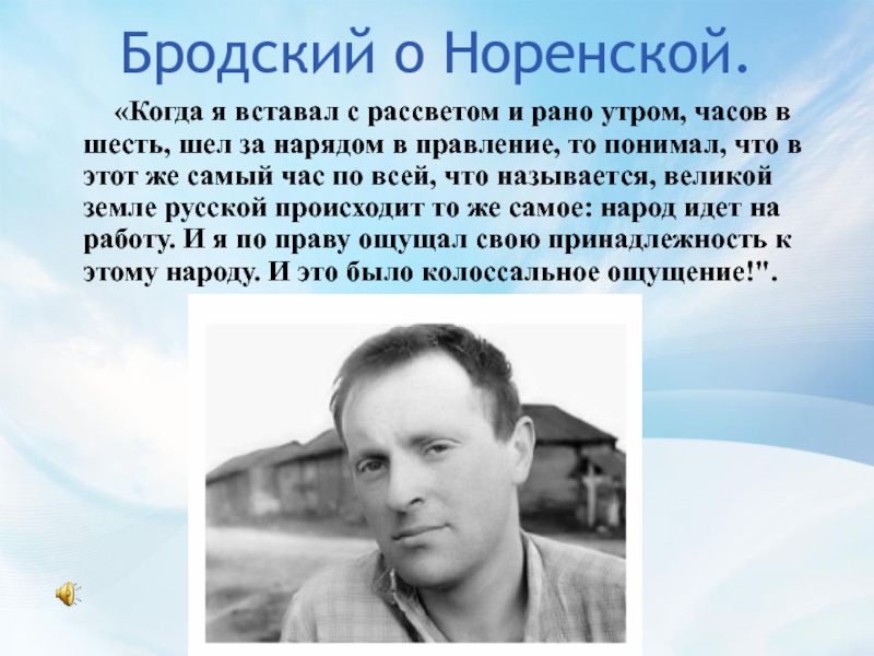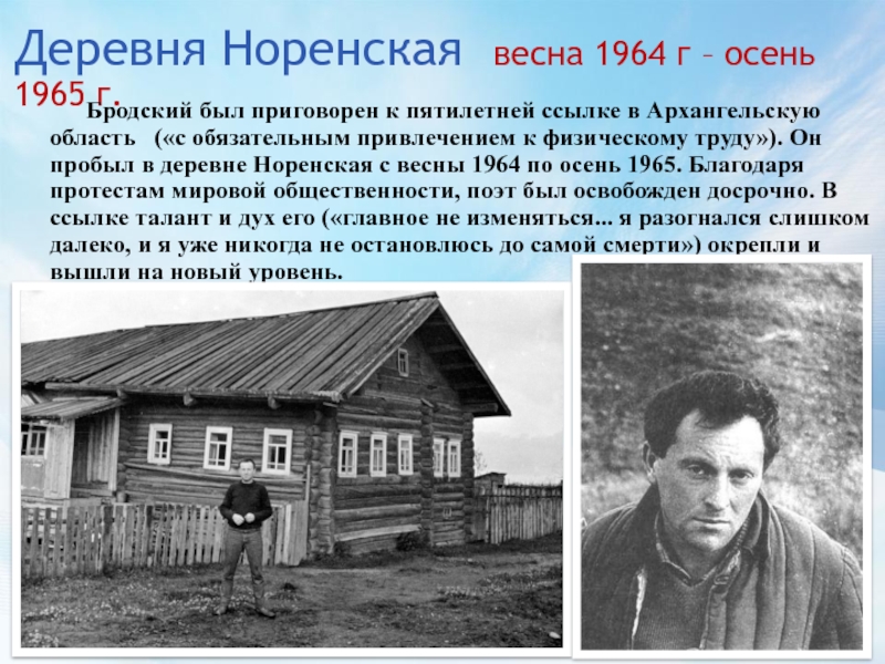 Бродский был приговорен к пятилетней ссылке в Архангельскую область («с обязательным привлечением к физическому труду»). Он пробыл в деревне Норенская с весны 1964 по осень 1965. Благодаря протестам мировой общественности, поэт был освобожден досрочно. В ссылке талант и дух его («главное не изменяться... я разогнался слишком далеко, и я уже никогда не остановлюсь до самой смерти») окрепли и вышли на новый уровень.