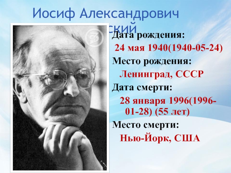 Слайд 38 Поэт Иосиф Бродский скоропостижно скончался в