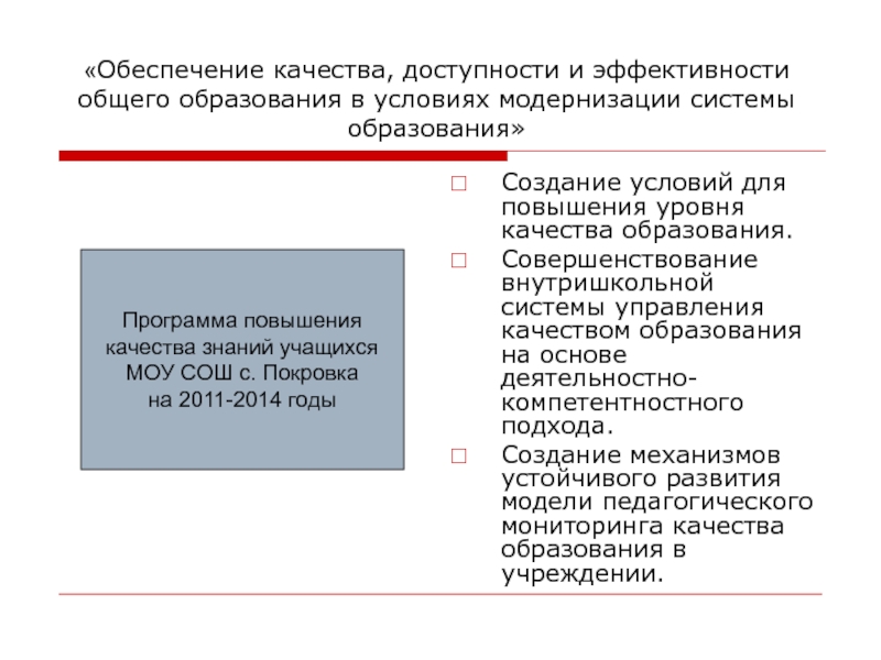 Совершенствование внутришкольной системы управления качеством образования на основе деятельностно-компетентностного подхода.