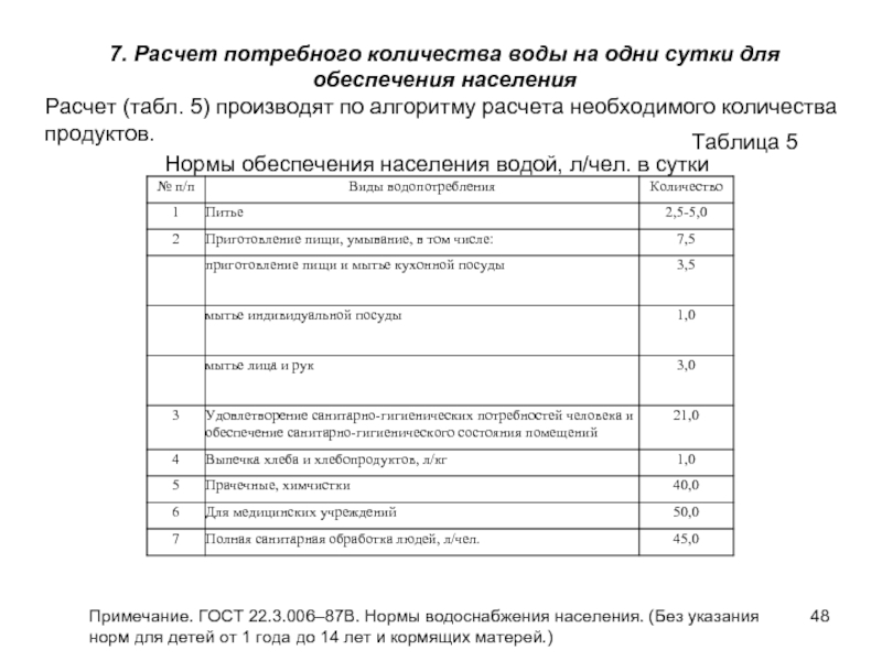 Примечание. ГОСТ 22.3.006–87В. Нормы водоснабжения населения. (Без указания норм для детей от 1 года до 14 лет и кормящих матерей.)