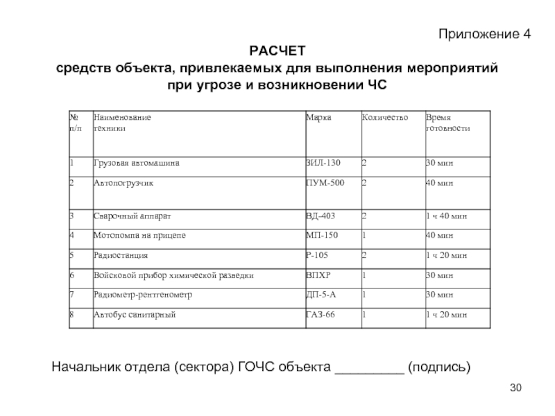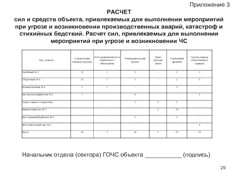 - расчет сил и средств объекта экономики (организации, учреждения), привлекаемых для выполнения мероприятий при угрозе и возникновении производственных аварий, катастроф и стихийных бедствий;