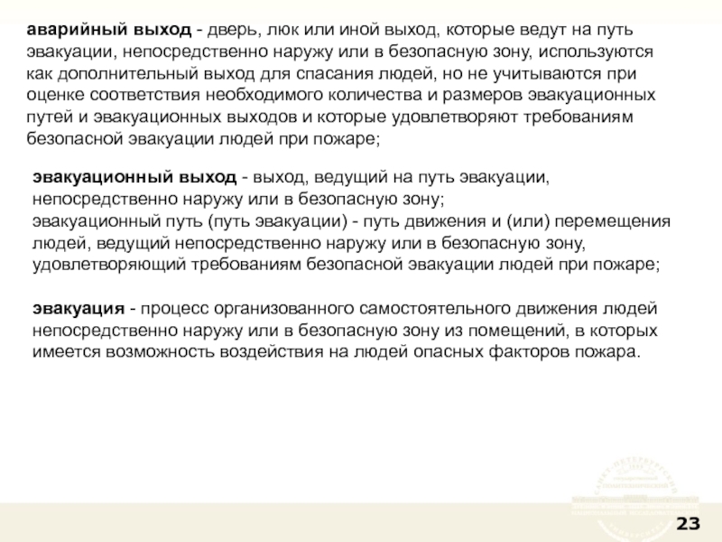 эвакуационный выход - выход, ведущий на путь эвакуации, непосредственно наружу или в безопасную зону;