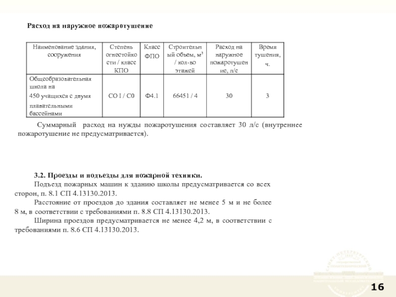 Суммарный расход на нужды пожаротушения составляет 30 л/с (внутреннее пожаротушение не предусматривается).