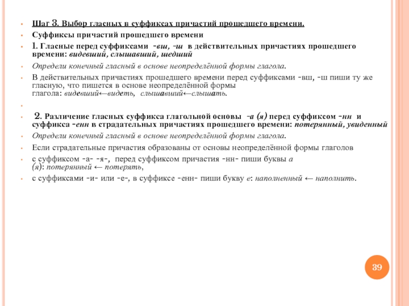 Слайд 39Шаг 3. Выбор гласных в суффиксах причастий прошедшего времени.