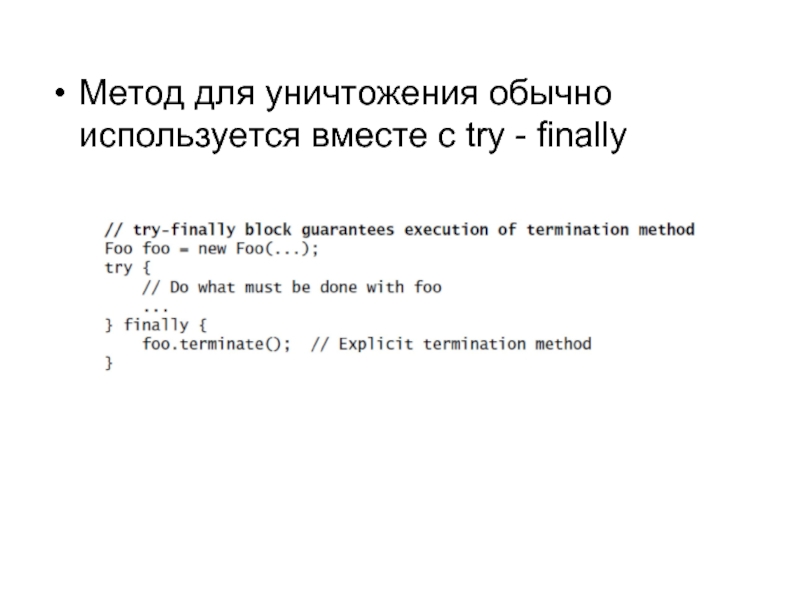 Слайд 14Метод для уничтожения обычно используется вместе с try - finally