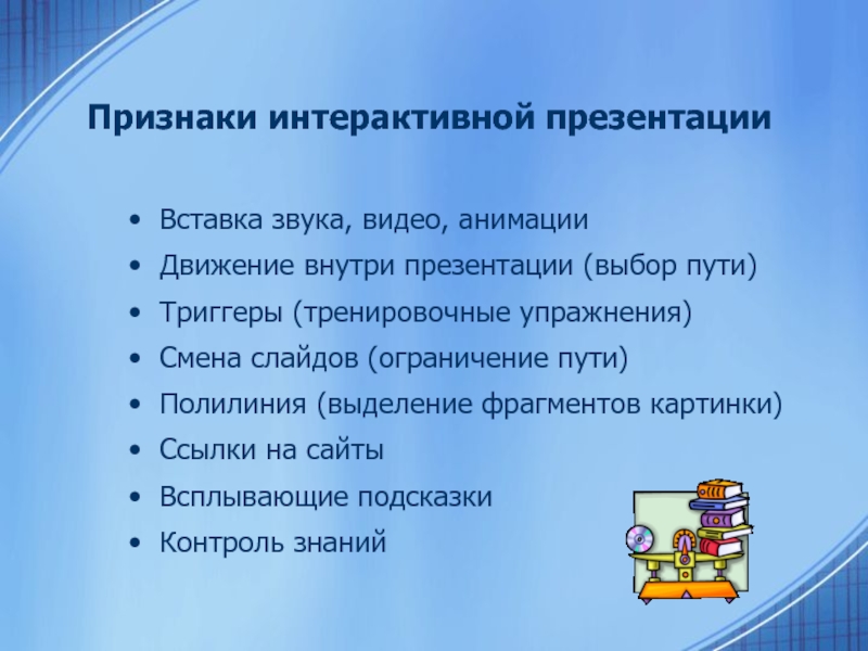 Интерактивные презентации - интерактивный продукт с возможностью самостоятельного выбора последовательности предоставления информации, активации разнообразных возможностей демонстрации
