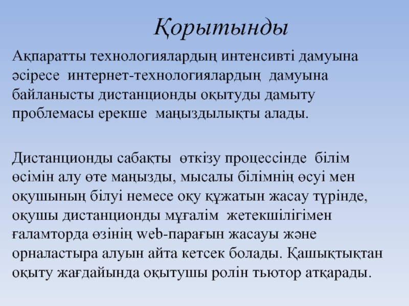 Дистанционды сабақты  өткізу процессінде  білім өсімін алу өте маңызды, мысалы білімнің өсуі мен  оқушының білуі немесе оқу құжатын жасау түрінде, оқушы дистанционды мұғалім  жетекшілігімен ғаламторда өзінің web-парағын жасауы және орналастыра алуын айта кетсек болады. Қашықтықтан оқыту жағдайында оқытушы ролін тьютор атқарады.