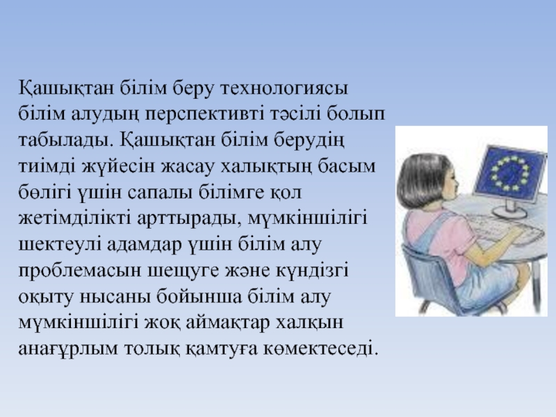 Слайд 5Қашықтан білім беру технологиясы білім алудың перспективті тәсілі болып табылады. Қашықтан