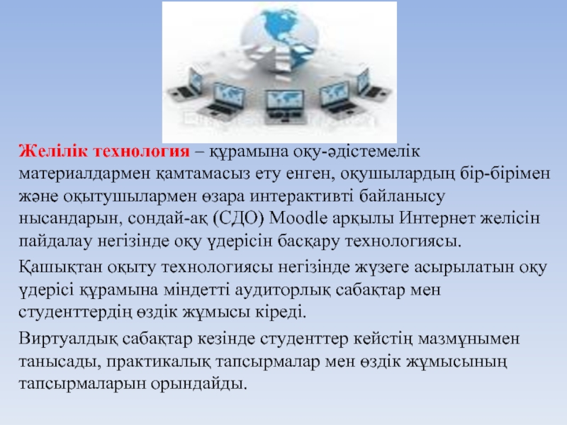 Слайд 7Желілік технология – құрамына оқу-әдістемелік материалдармен қамтамасыз ету енген, оқушылардың бір-бірімен және