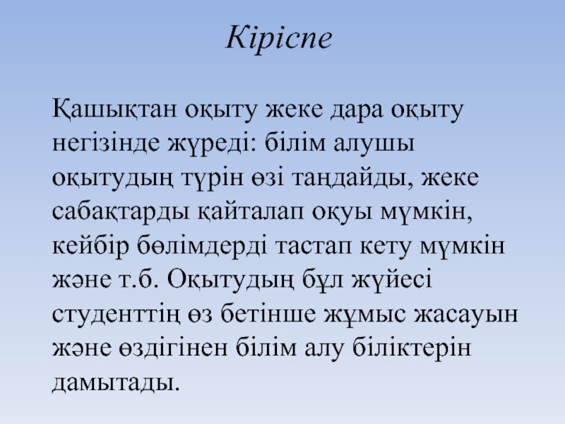 Қашықтан оқыту жеке дара оқыту негізінде жүреді: білім алушы оқытудың түрін