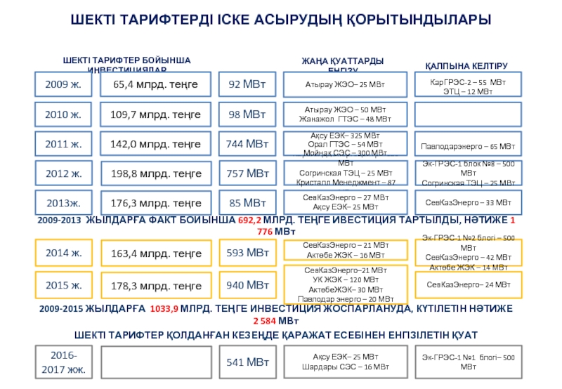 2009-2013 ЖЫЛДАРҒА ФАКТ БОЙЫНША 692,2 МЛРД. ТЕҢГЕ ИВЕСТИЦИЯ ТАРТЫЛДЫ, НӘТИЖЕ 1 776 МВт