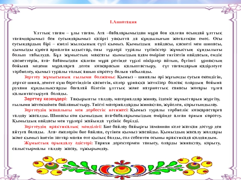 А.Жақтаева «Қымыз жанға- дауа, дертке- шипа»