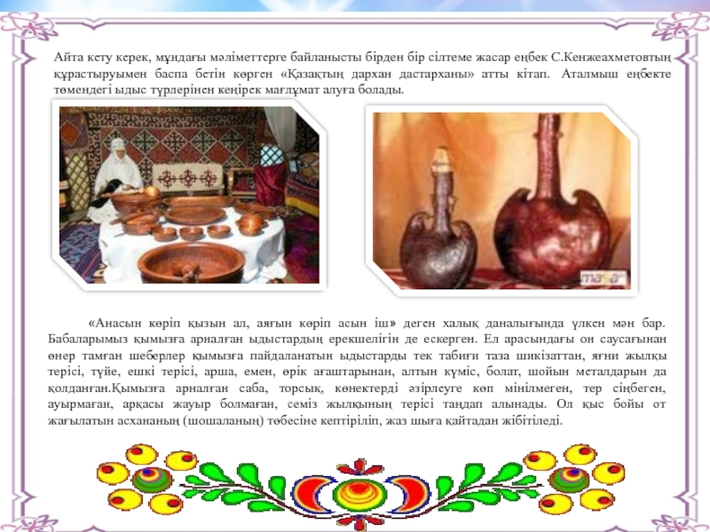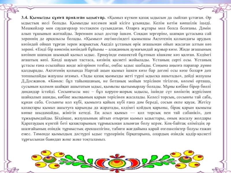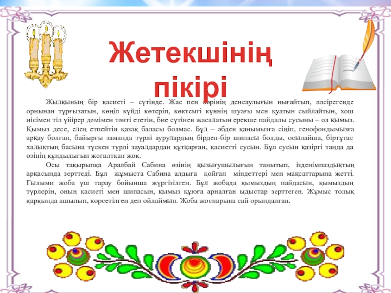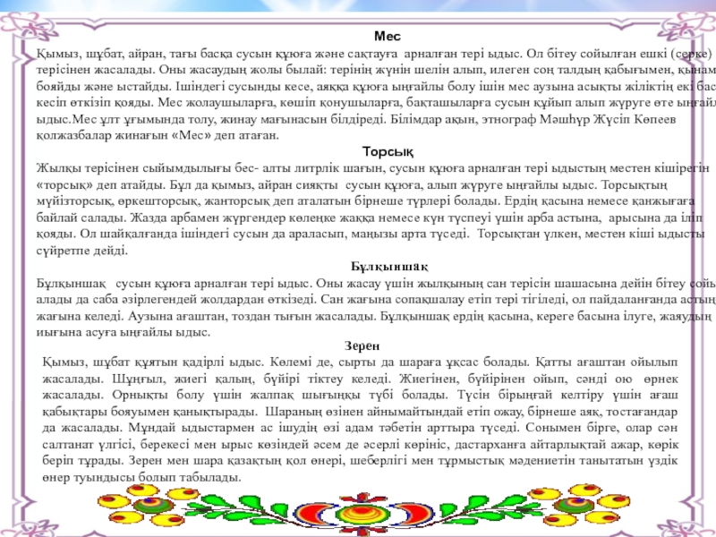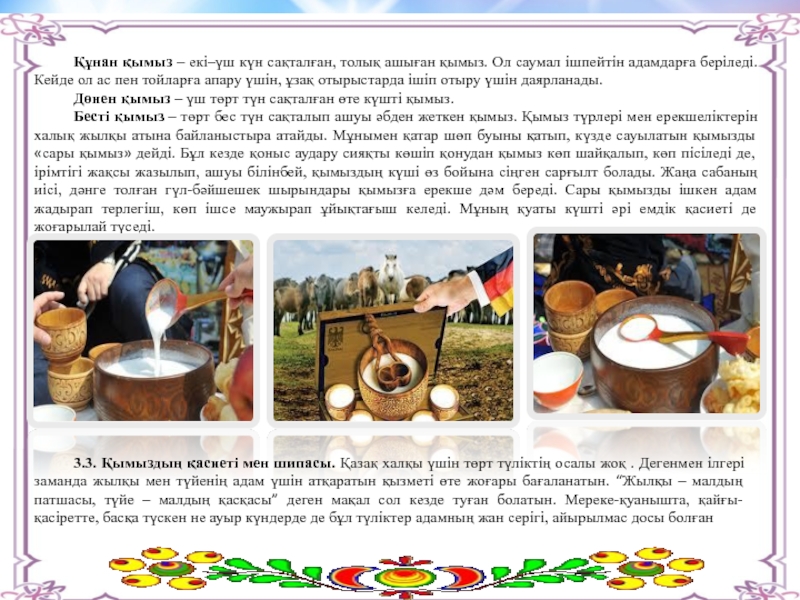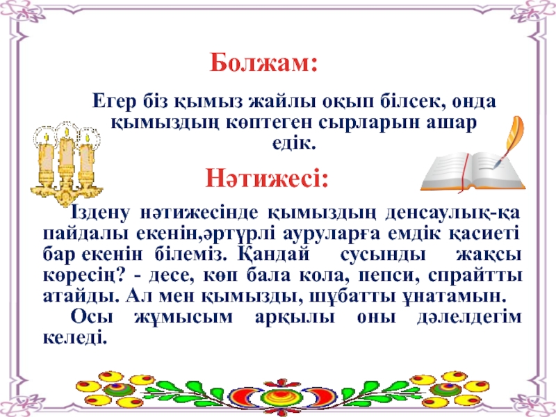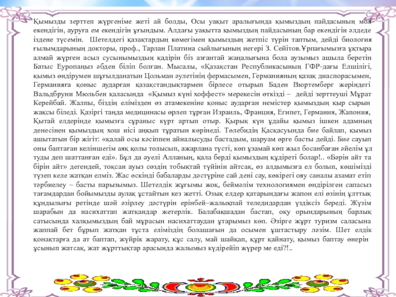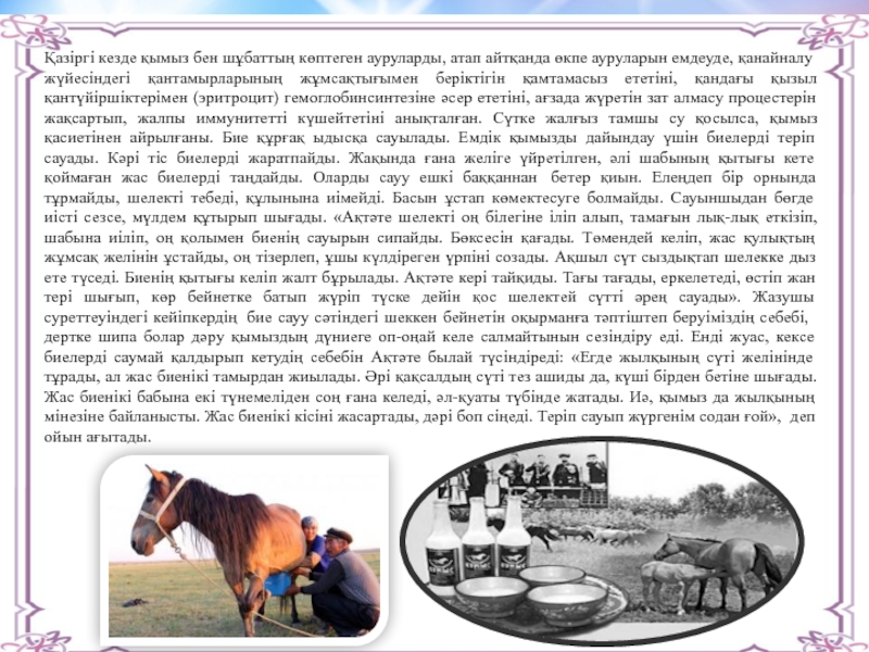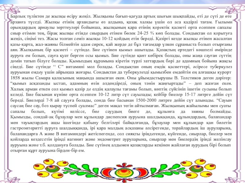 Слайд 7Егер біз қымыз жайлы оқып білсек, онда қымыздың көптеген сырларын ашар