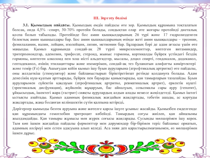 3.1. Қымыздың пайдасы. Қымыздың емдік пайдасы өте зор. Қымыздың