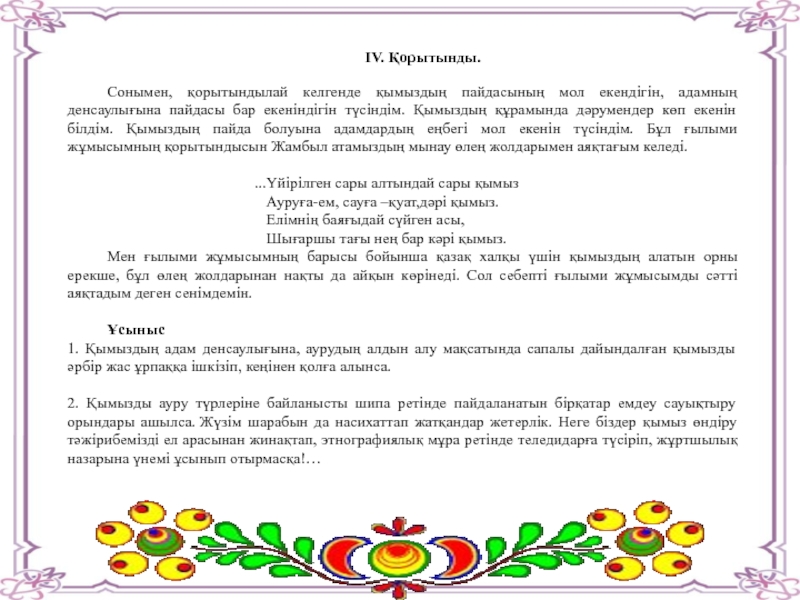 Мен ғылыми жұмысымның барысы бойынша қазақ халқы үшін қымыздың алатын орны ерекше, бұл өлең жолдарынан нақты да айқын көрінеді. Сол себепті ғылыми жұмысымды сәтті аяқтадым деген сенімдемін.