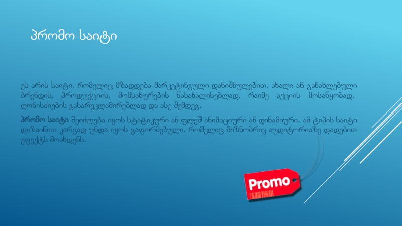 პრომო საიტი შეიძლება იყოს სტატიკური ან ფლეშ ანიმაციური ან დინამიური. ამ ტიპის საიტი დიზაინით კარგად უნდა იყოს გაფორმებული, რომელიც მიზნობრივ აუდიტორიაზე დადებით ეფექტს მოახდენს.