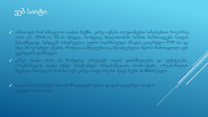 როგორიც არის ე.წ. HTML-ის ISS-ის სწავლა, რომელიც მთლიანობაში ბაზისს წარმოადგენს საიტის შესაქმნელად. შემდეგში სასურველია, უფრო სიღრმისეული სწავლა გააგრძელო PHP-ისა და სხვა პროგრამული ენების, რომლთა საშუალებითაც შესაძლებელია ზემოთ ჩამოთვლილი ვებ-გვერდების დამზადება.