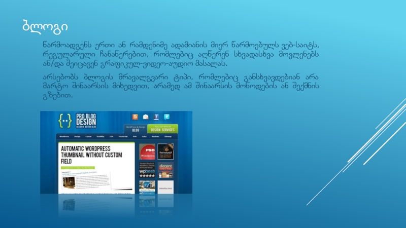 წარმოადგენს ერთი ან რამდენიმე ადამიანის მიერ წარმოებულს ვებ-საიტს, რეგულარული ჩანაწერებით, რომლებიც აღწერენ
