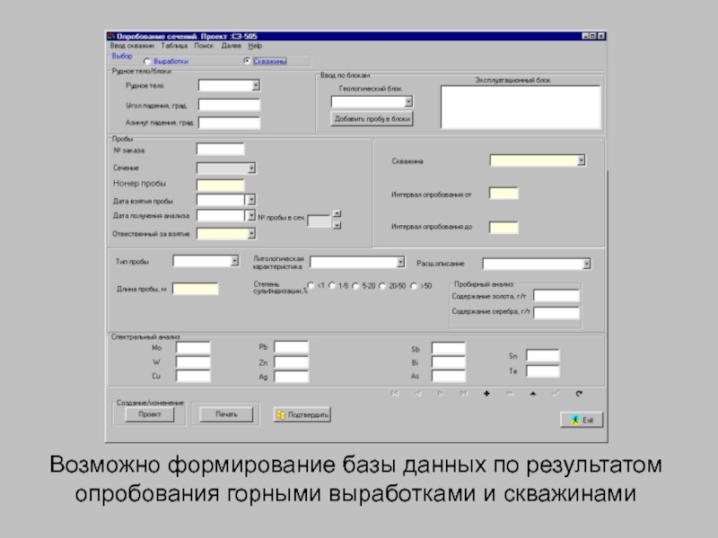 Слайд 6Возможно формирование базы данных по результатом опробования горными выработками и скважинами