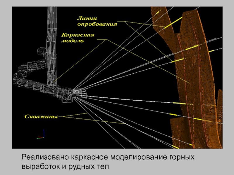 Слайд 10Реализовано каркасное моделирование горных выработок и рудных тел