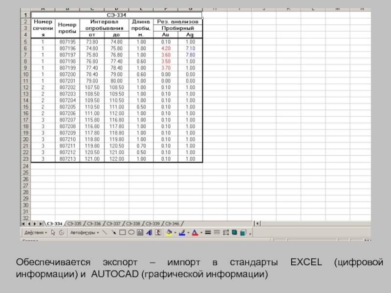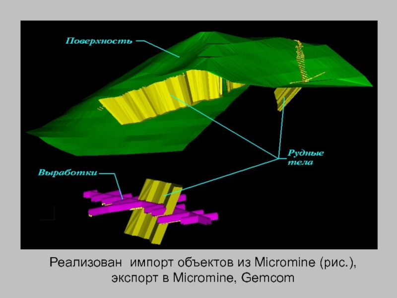 Слайд 8Реализован импорт объектов из Micromine (рис.), экспорт в Micromine, Gemcom